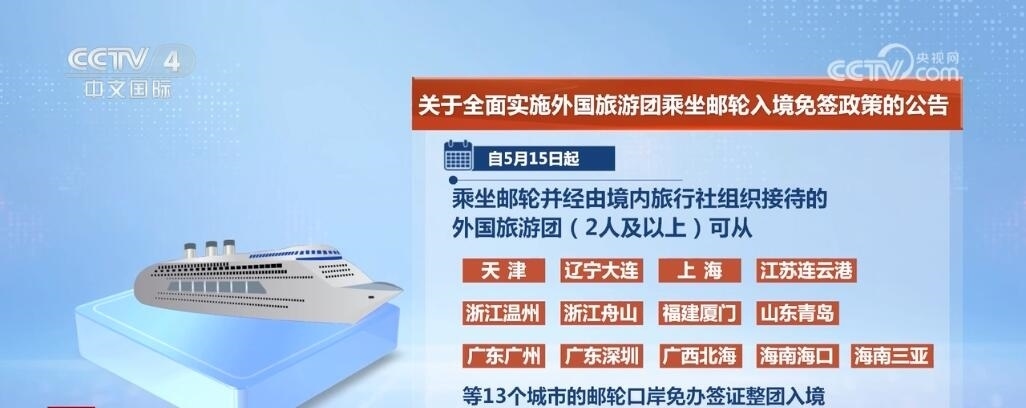 央視網消息:中國國家移民管理局發(fā)布公告,為進一步促進便利外籍人員來華旅游,自5月15日起,在中國沿海省份全面實施外國旅游團乘坐郵輪入境免簽政策,乘坐郵輪來華并經由境內旅行社組織接待的外國旅游團可從中國沿海所有郵輪口岸免辦簽證入境停留15天。