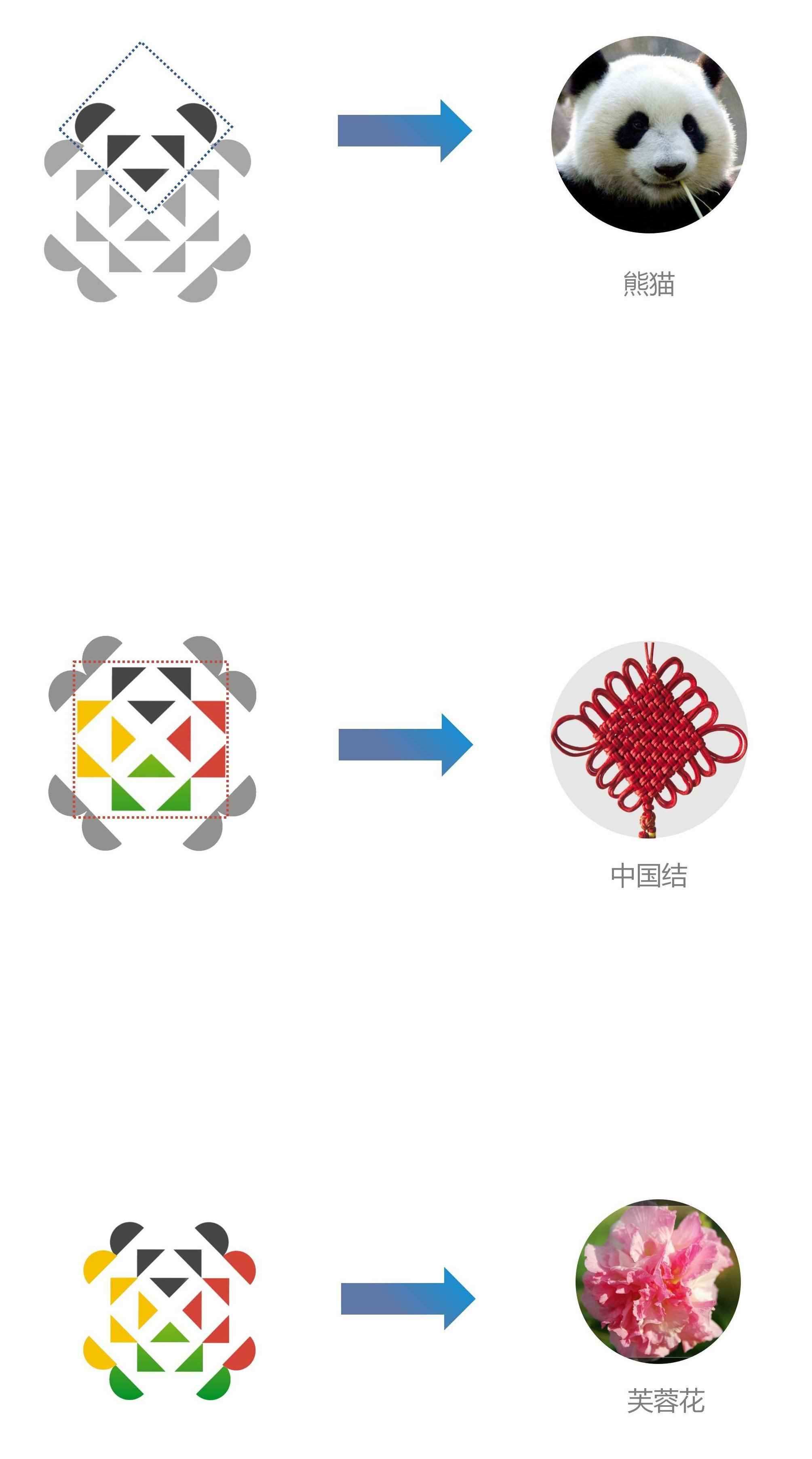 會(huì)徽設(shè)計(jì)靈感源于中國(guó)的大熊貓、芙蓉花和中國(guó)結(jié),以中國(guó)紅、金沙黃、公園綠、熊貓黑、雪山白為主色調(diào)。作為 2025 年成都世界運(yùn)動(dòng)會(huì)的重要標(biāo)志,這一會(huì)徽有效傳達(dá)了奧林匹克精神又凸顯了中國(guó)傳統(tǒng)元素和成都特色,彰顯了“團(tuán)結(jié)、包容、多樣性”的價(jià)值觀。同時(shí),設(shè)計(jì)師秉承色彩明快、造型簡(jiǎn)潔的設(shè)計(jì)理念,其外圍的半圓圖案和內(nèi)部排列的三角形,圍成一朵盛開(kāi)的芙蓉花;紅、黑、黃、綠、白的幾何色塊拼出可愛(ài)的卡通大熊貓。