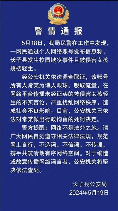 ·為流量造謠女生受欺凌輕生網(wǎng)民被行拘,警方通報:相關涉事人員被處罰,造謠女生輕生者被行拘。