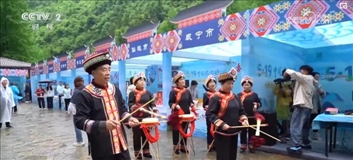 在湖北利川騰龍景區(qū),穿著絢麗多彩的土家族服裝的阿哥阿妹,在億萬年前形成的天然溶洞前翩翩起舞、擊鼓迎賓。