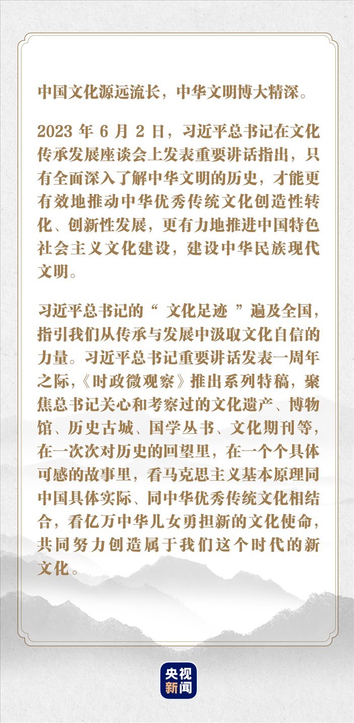 “這段時(shí)間,我一直在思考推進(jìn)中國(guó)特色社會(huì)主義文化建設(shè)、建設(shè)中華民族現(xiàn)代文明這個(gè)重大問(wèn)題?!?023年6月2日,在文化傳承發(fā)展座談會(huì)上,習(xí)近平總書(shū)記指出,“只有全面深入了解中華文明的歷史,才能更有效地推動(dòng)中華優(yōu)秀傳統(tǒng)文化創(chuàng)造性轉(zhuǎn)化、創(chuàng)新性發(fā)展,更有力地推進(jìn)中國(guó)特色社會(huì)主義文化建設(shè),建設(shè)中華民族現(xiàn)代文明?!?/p>