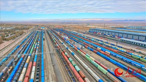 阿拉山口站編組場(chǎng)內(nèi)??恐l(fā)的中歐班列及其他出入境貨物列車。人民網(wǎng) 李欣洋攝