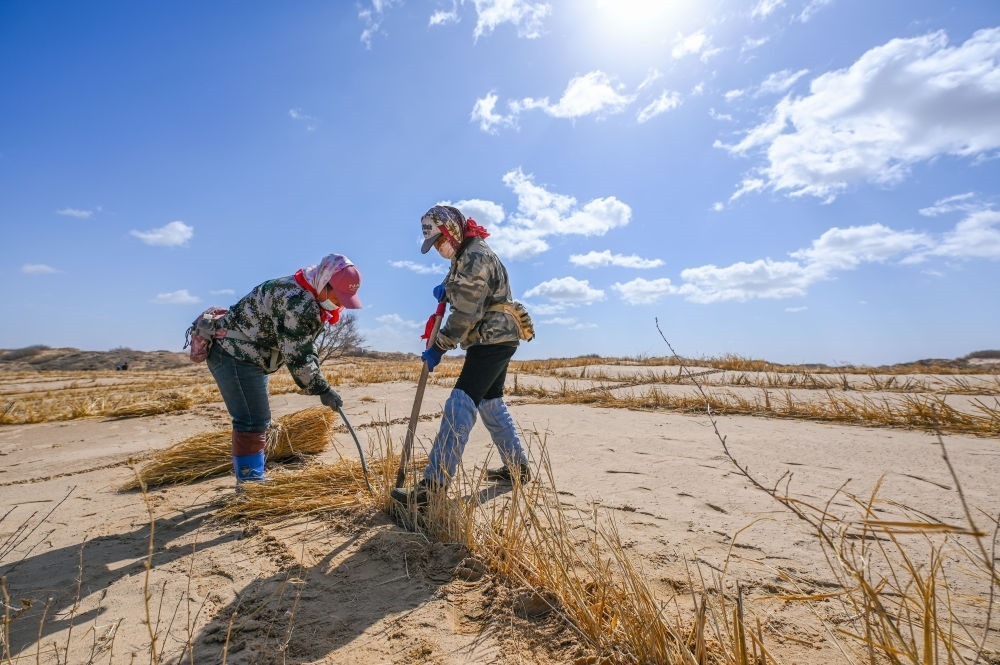 ?2024年3月12日,治沙工人在內(nèi)蒙古巴彥淖爾市磴口縣境內(nèi)的烏蘭布和沙漠防沙治沙和風(fēng)電光伏一體化工程基地壓制草方格。新華社記者 李云平 攝
