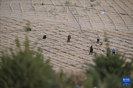 在內(nèi)蒙古赤峰市翁牛特旗巴彥呼交嘎查其白線防沙治沙項目區(qū),治沙工人在拉滴灌帶。新華社記者 連振 攝