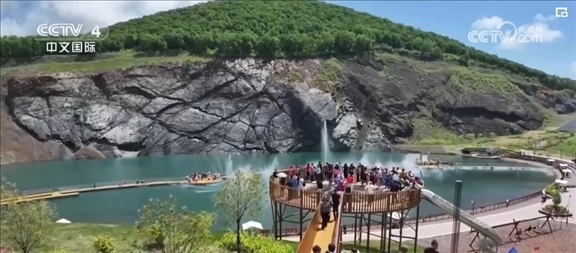 在黑龍江雙鴨山的翡翠湖礦坑公園,藍綠色湖水在陽光照耀下如詩如畫。游客們身處山野間,感受著自然之美和夏日清涼。