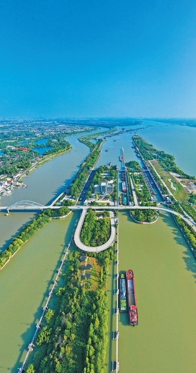 生態(tài)保護船只有序通過揚州邵伯船閘。本報記者 雷 聲攝