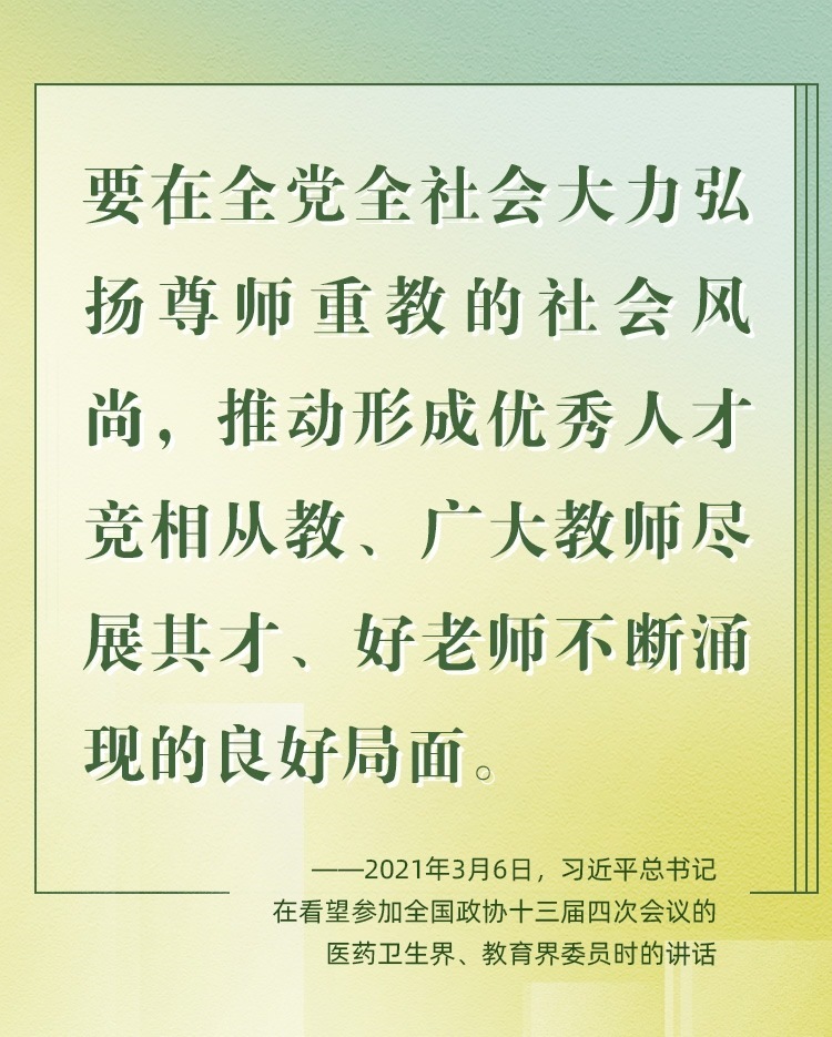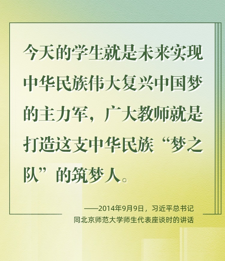 因為熱愛,所以一生堅持。老師是中華民族“夢之隊”的筑夢人,是新時代的“大先生”。從傳播知識、啟迪思想、無私奉獻,到“讓每個人都有實現(xiàn)夢想的機會”;從教書到育人,從個人到家國,從小我到大我,“培養(yǎng)德智體美勞全面發(fā)展的社會主義建設(shè)者和接班人”,老師,已然是喚起一代代學(xué)子追隨先輩、培養(yǎng)家國情懷、櫛風沐雨、砥礪前行的力量。