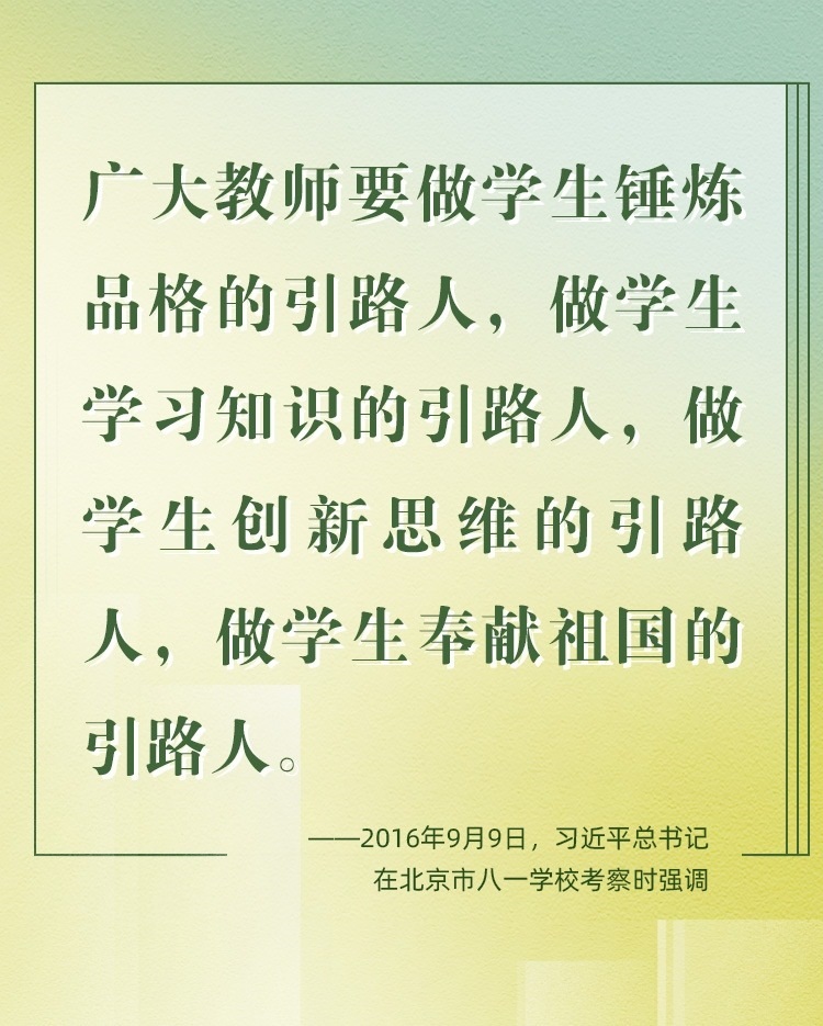 他們帶領(lǐng)學(xué)生前行,更新舊知、開掘新知、探索未知;他們肩負光榮使命,為黨育人、為國育才、為民育未來。守教育報國初心、擔立德樹人使命、圓民族復(fù)興之夢,建設(shè)社會主義現(xiàn)代化強國之路上,教育家精神自當念茲在茲、代代傳承、光芒永綻。