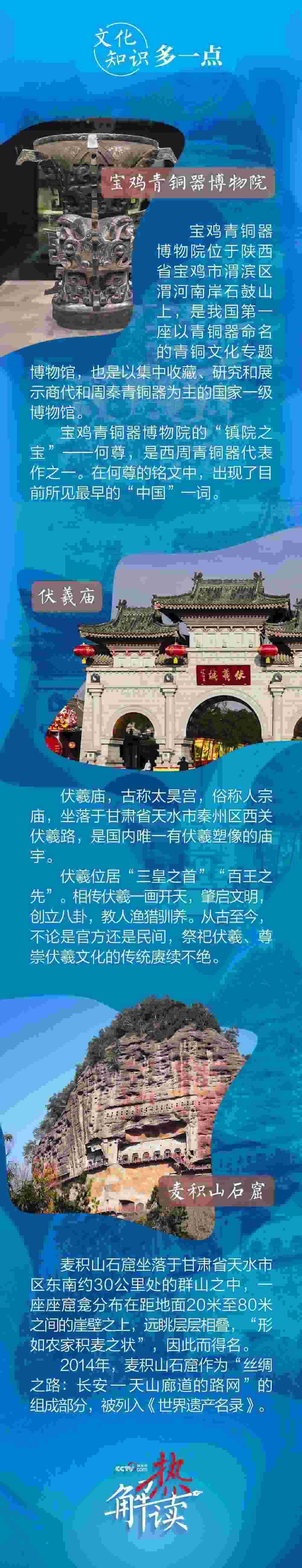 9月10日下午至11日上午,習(xí)近平總書記先后來到陜西省寶雞市和甘肅省天水市考察調(diào)研。此次陜甘行中,總書記專門考察了三處文化地標(biāo)。