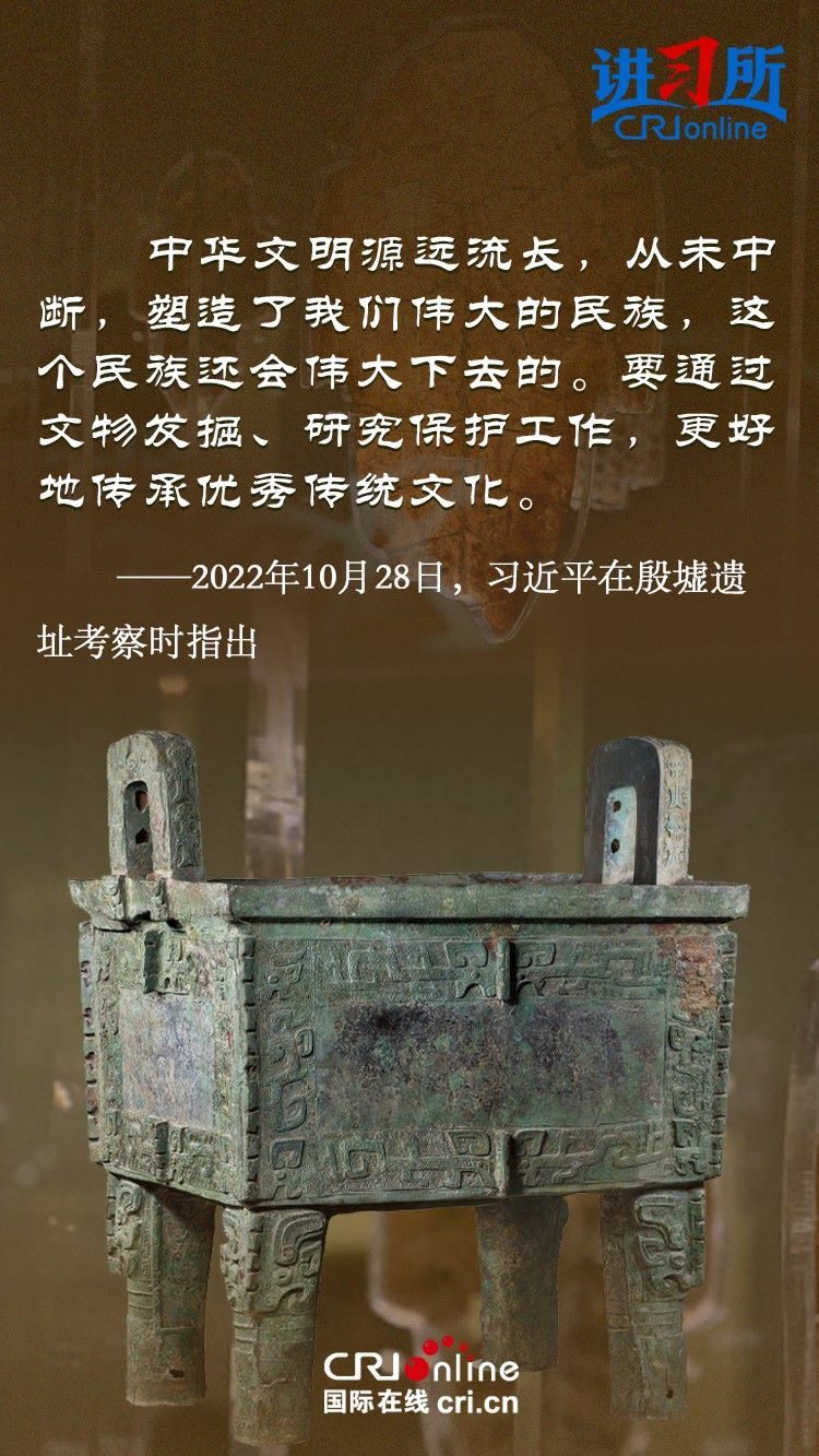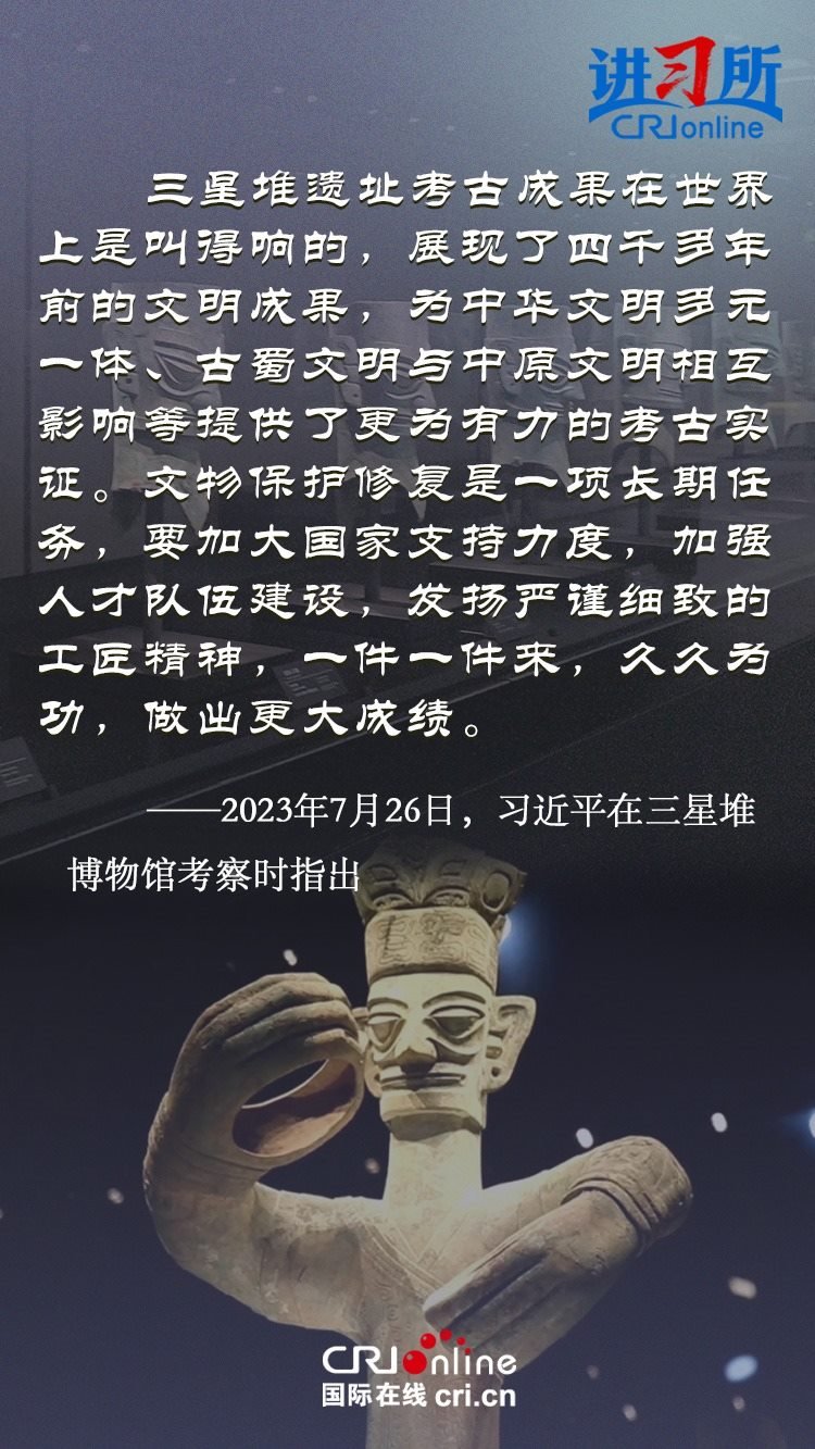 文物和文化遺產承載燦爛文明,傳承歷史文化,維系民族精神。三星堆博物館、殷墟遺址、敦煌研究院……這些年,習近平高度重視中華文明探源工程和文物保護工作,強調要把中華文明歷史引向深入,把中華優(yōu)秀傳統(tǒng)文化一代一代傳下去。