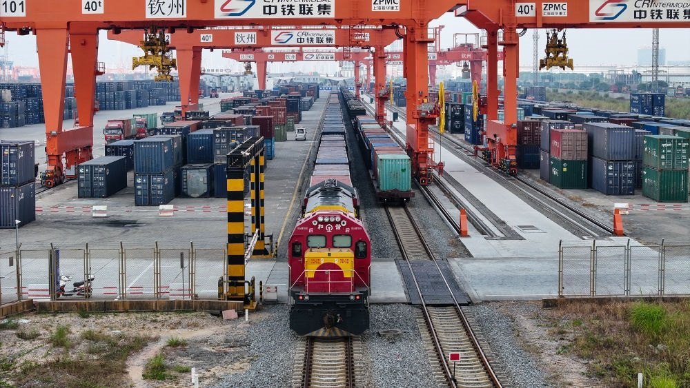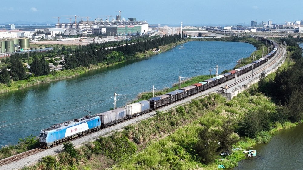 西部陸海新通道鐵海聯(lián)運班列從欽州港東站駛出(2024年5月12日攝,無人機照片)。隨著中國-東盟開放平臺建設(shè)向縱深推進(jìn),西部陸海新通道正在成為釋放開放活力的強力新引擎,以物流為切入口,促進(jìn)資金、資源、人員、技術(shù)等生產(chǎn)要素深度融合。