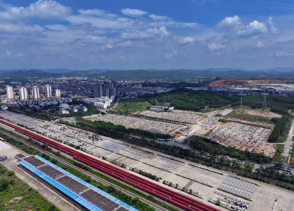 汽車在廣西柳州雒容汽車物流基地等待進(jìn)入鐵路貨車車廂。部分出口的新能源汽車從這里裝車運往各大出海港口(2024年5月24日攝,無人機照片)。