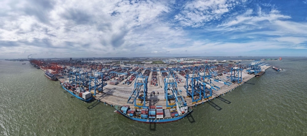 2024年6月13日,途經(jīng)馬來西亞關(guān)丹港的“海豐博多”輪在廣西欽州港集裝箱裝卸自動化碼頭進(jìn)行裝卸作業(yè)(無人機全景照片)。