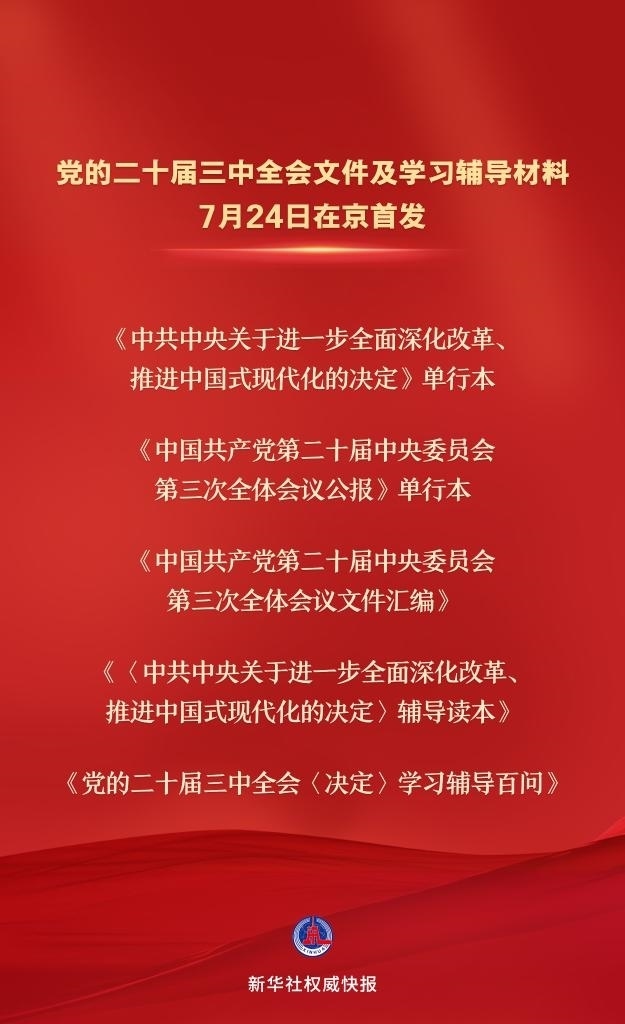 黨的二十屆三中全會文件及學(xué)習輔導(dǎo)材料7月24日在京首發(fā)
