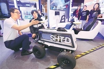 工作人員在二〇二四全球數(shù)字經(jīng)濟(jì)大會(huì)沉浸式體驗(yàn)區(qū)介紹自動(dòng)駕駛無(wú)人車。陳曉根攝(人民視覺(jué))