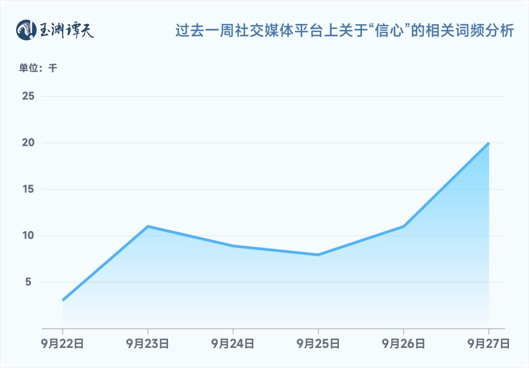 從這張曲線(xiàn)圖上可以看到,輿論場(chǎng)對(duì)“中國(guó)經(jīng)濟(jì)”的討論,在過(guò)去一周經(jīng)歷了2個(gè)峰值。其中,“信心”這個(gè)詞出現(xiàn)的頻率經(jīng)歷了兩次躍升。
