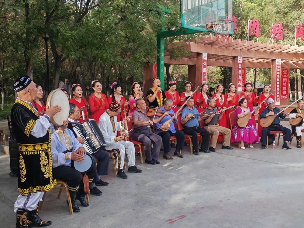 2024年9月19日,新疆庫爾勒市朝陽街道團結(jié)社區(qū)石榴籽樂團在為居民們表演。新華社記者 顧煜 攝