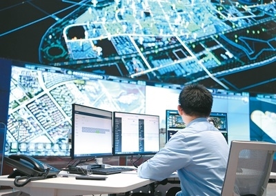 在天津市濱海新區(qū)中新天津生態(tài)城智慧城市運(yùn)營中心內(nèi),工作人員在查看監(jiān)控。新華社記者 趙子碩攝