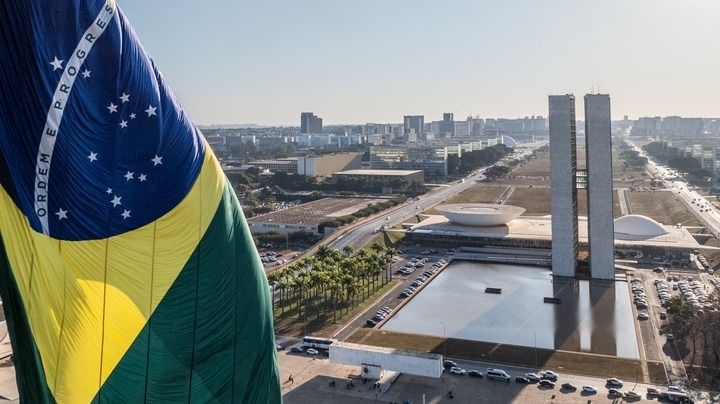 這是2024年7月16日在巴西首都巴西利亞拍攝的國會大廈(無人機照片)。新華社記者 王天聰 攝