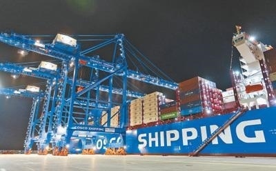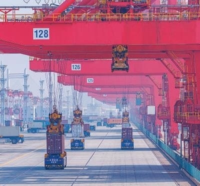 軟聯(lián)通共建“一帶一路”國家在工作制度對接、技術標準協(xié)調、檢驗結果互認等方面強化合作、統(tǒng)一標準,貿易自由化便利化水平不斷提升。上海洋山港海關對接共建國家進出口貨物相關標準,推動通關一體化方式申報,提升通關效率。圖為無人駕駛的全自動導引車在洋山港穿梭往來,搬運集裝箱。王 初攝(影像中國)