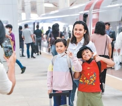 硬聯(lián)通雅萬高鐵是我國在境外完成全過程勘察設計建設的首個高鐵項目,于去年10月17日正式開通運營,是中印尼共建“一帶一路”合作的典范。圖為乘客在和雅萬高鐵動車組合影留念。新華社記者 徐 欽攝