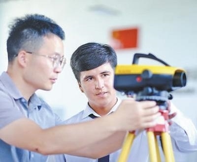心聯(lián)通在塔吉克斯坦首都杜尚別的魯班工坊,來自天津城市建設管理職業(yè)技術學院的老師(左)為當?shù)貙W生提供指導。新華社記者 鄭開君攝