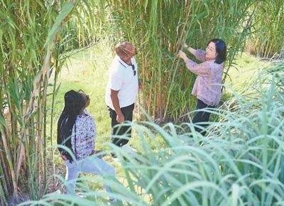 心聯(lián)通福建農林大學國際菌草工程技術研究中心工作人員(右)在向盧旺達留學生介紹菌草品種“綠洲1號”蘆竹的生長情況。新華社記者 林善傳攝