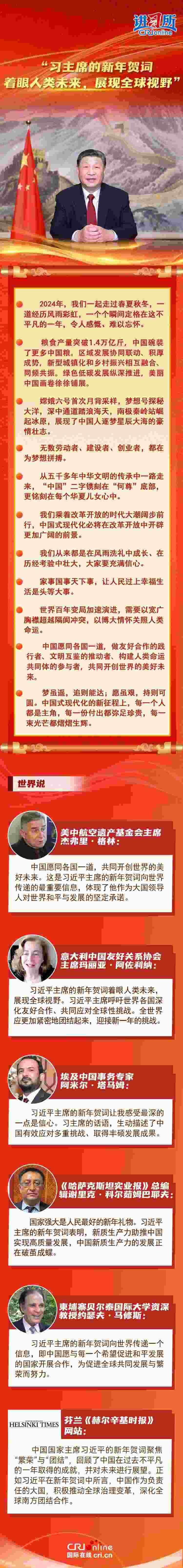 多國(guó)人士認(rèn)為,習(xí)近平主席的新年賀詞著眼人類(lèi)未來(lái),展現(xiàn)全球視野,體現(xiàn)了作為大國(guó)領(lǐng)導(dǎo)人對(duì)世界和平與發(fā)展的堅(jiān)定承諾。
