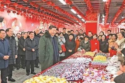 沈陽大東副食品商場歷史悠久,富有特色的年節(jié)商品琳瑯滿目。23日上午,習(xí)近平來到這里,察看多家店鋪,頻頻同店主和顧客交流,詳細(xì)了解節(jié)日期間市場供應(yīng)情況。大家見到總書記都十分激動(dòng),連聲歡呼“總書記好”!習(xí)近平對大家說,“菜籃子”、“米袋子”、“果盤子”是民生大事,現(xiàn)在物質(zhì)豐裕,過年團(tuán)圓更要讓大家吃得好、吃得健康。