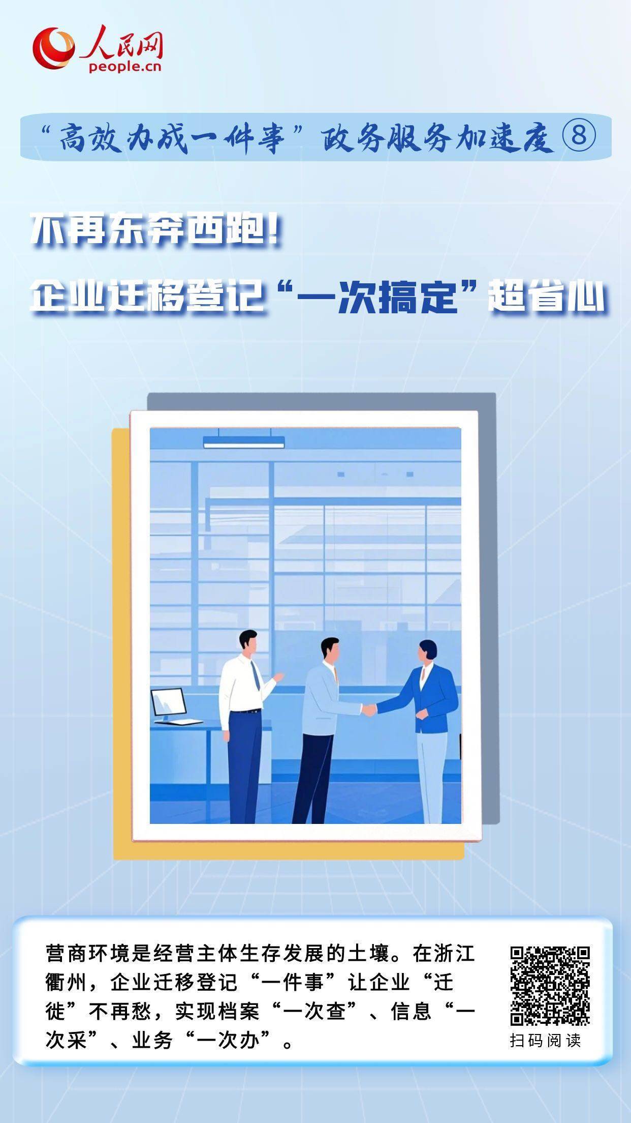 在浙江衢州,企業(yè)“遷徙”不再愁,通過建立線下協(xié)同、線上議題聯(lián)動機制,將原先企業(yè)遷移涉及7個部門15個環(huán)節(jié),壓減為通過“1個平臺、1個環(huán)節(jié)”,實現(xiàn)檔案“一次查”、信息“一次采”、業(yè)務(wù)“一次辦”。