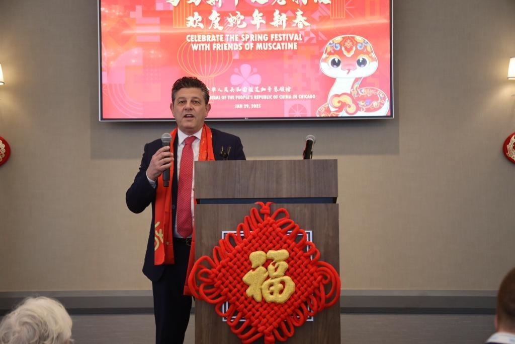 與中國有著多年情誼的艾奧瓦州友人系上了紅圍巾、紅領帶,和年輕人一起感受著蛇年新春的歡樂氛圍?!皩ξ襾碚f,同這么多美中兩國年輕人共慶蛇年,就是最好的慶祝方式。”蘭蒂說。