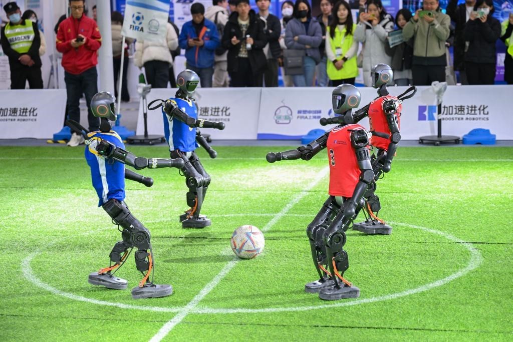 2月21日,機(jī)器人在2025全球開發(fā)者先鋒大會現(xiàn)場踢足球。 新華社發(fā)(陳浩明 攝)
