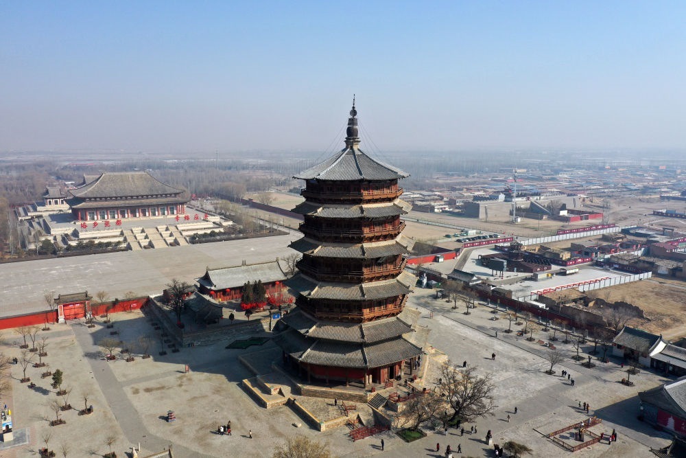 位于山西朔州市的應(yīng)縣木塔建于遼代清寧二年(1056年),塔高67.31米,上下連接的全部架構(gòu)均由卯榫咬合而成,是世界上現(xiàn)存最古老、最高大的純木結(jié)構(gòu)建筑(2025年3月7日攝,無人機(jī)照片)。