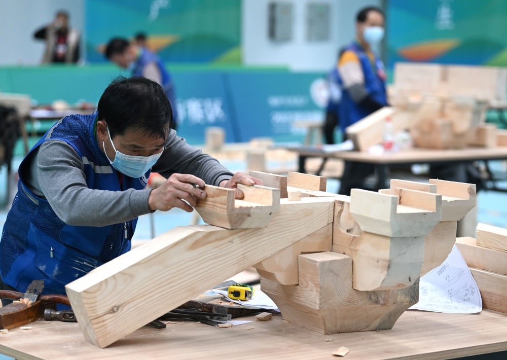 2023年3月25日,全國文物行業(yè)職業(yè)技能大賽在山西太原舉行,全國兩百余名選手現(xiàn)場比拼文物修復(fù)和考古探掘技術(shù)。這是參加木作文物修復(fù)師比賽項(xiàng)目的選手制作木質(zhì)傳統(tǒng)建筑構(gòu)件。
