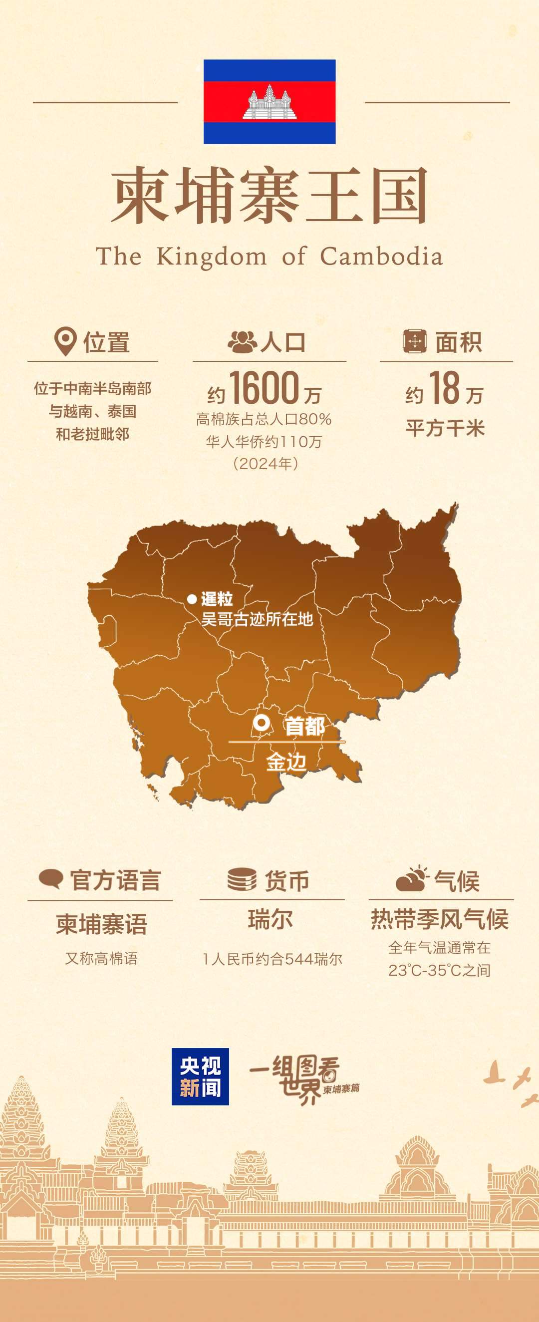 從國旗上的千年古跡吳哥窟,到湄公河畔會“呼吸”的洞里薩湖;從元代周達(dá)觀筆下的《真臘風(fēng)土記》,到與中國結(jié)下深厚情誼的西哈努克;從共建“一帶一路”的金港高速公路,到“鉆石六邊”合作架構(gòu)不斷充實(shí)……通過一組圖,帶您了解中國的這個“鐵桿”朋友——柬埔寨↓↓↓