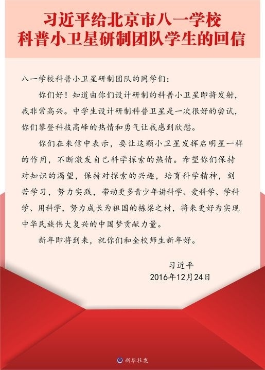 三個(gè)多月后,同學(xué)們給習(xí)近平總書記寫信,報(bào)告小衛(wèi)星即將發(fā)射的消息,很快收到了總書記的回信。習(xí)近平總書記在回信中說(shuō),“你們攀登科技高峰的熱情和勇氣讓我感到欣慰”“希望你們保持對(duì)知識(shí)的渴望,保持對(duì)探索的興趣,培育科學(xué)精神,刻苦學(xué)習(xí),努力實(shí)踐,帶動(dòng)更多青少年講科學(xué)、愛(ài)科學(xué)、學(xué)科學(xué)、用科學(xué),努力成長(zhǎng)為祖國(guó)的棟梁之材”。