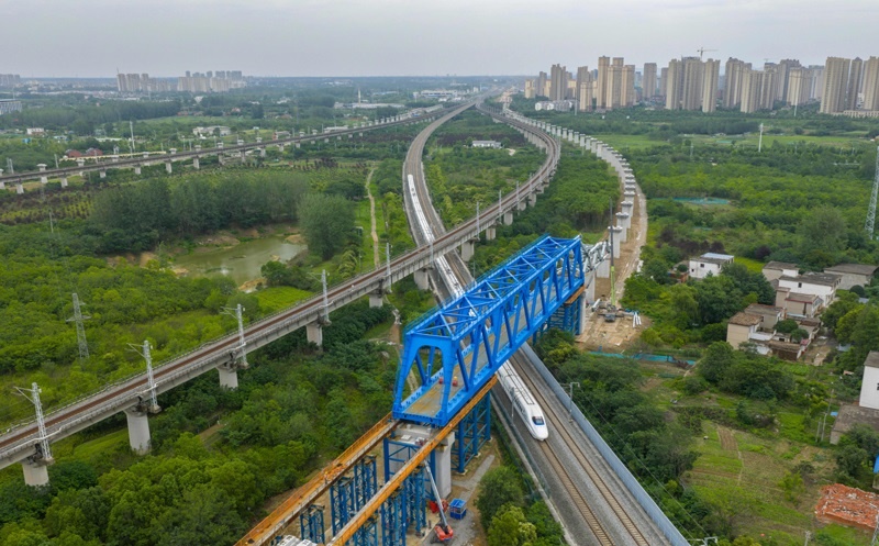 新建滬寧合高鐵鋼桁梁跨越滬蓉鐵路(6月15日攝,無(wú)人機(jī)照片)。