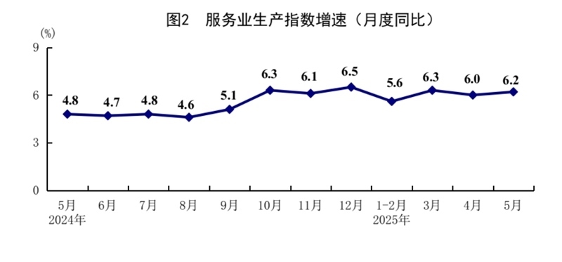 5月份,全國服務(wù)業(yè)生產(chǎn)指數(shù)同比增長6.2%,比上月加快0.2個百分點(diǎn)。分行業(yè)看,信息傳輸、軟件和信息技術(shù)服務(wù)業(yè),租賃和商務(wù)服務(wù)業(yè),批發(fā)和零售業(yè)生產(chǎn)指數(shù)同比分別增長11.2%、8.9%、8.4%,分別快于服務(wù)業(yè)生產(chǎn)指數(shù)5.0、2.7、2.2個百分點(diǎn)。1—5月份,全國服務(wù)業(yè)生產(chǎn)指數(shù)同比增長5.9%。1—4月份,規(guī)模以上服務(wù)業(yè)企業(yè)營業(yè)收入同比增長7.2%。5月份,服務(wù)業(yè)商務(wù)活動指數(shù)為50.2%,比上月上升0.1個百分點(diǎn);服務(wù)業(yè)業(yè)務(wù)活動預(yù)期指數(shù)為56.5%,上升0.1個百分點(diǎn)。其中,鐵路運(yùn)輸、航空運(yùn)輸、郵政、電信廣播電視及衛(wèi)星傳輸服務(wù)、互聯(lián)網(wǎng)軟件及信息技術(shù)服務(wù)等行業(yè)商務(wù)活動指數(shù)位于55.0%以上較高景氣區(qū)間。
