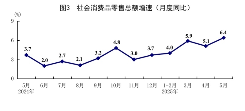5月份,社會消費(fèi)品零售總額41326億元,同比增長6.4%,比上月加快1.3個百分點(diǎn);環(huán)比增長0.93%。按經(jīng)營單位所在地分,城鎮(zhèn)消費(fèi)品零售額36057億元,同比增長6.5%;鄉(xiāng)村消費(fèi)品零售額5269億元,增長5.4%。按消費(fèi)類型分,商品零售額36748億元,增長6.5%;餐飲收入4578億元,增長5.9%?;旧铑惡筒糠稚夘惿唐蜂N售增勢較好,限額以上單位糧油食品類、金銀珠寶類、體育娛樂用品類商品零售額分別增長14.6%、21.8%、28.3%。消費(fèi)品以舊換新政策持續(xù)顯效,限額以上單位家用電器和音像器材類、通訊器材類、文化辦公用品類、家具類商品零售額分別增長53.0%、33.0%、30.5%、25.6%。1—5月份,社會消費(fèi)品零售總額203171億元,同比增長5.0%。全國網(wǎng)上零售額60402億元,同比增長8.5%。其中,實(shí)物商品網(wǎng)上零售額49878億元,增長6.3%,占社會消費(fèi)品零售總額的比重為24.5%。1—5月份,服務(wù)零售額同比增長5.2%。
