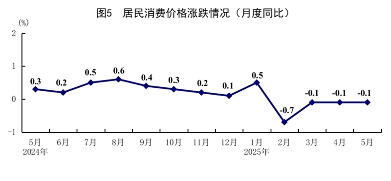 5月份,全國居民消費(fèi)價格(CPI)同比下降0.1%,環(huán)比下降0.2%。分類別看,食品煙酒價格同比上漲0.1%,衣著價格上漲1.5%,居住價格上漲0.1%,生活用品及服務(wù)價格上漲0.1%,交通通信價格下降4.3%,教育文化娛樂價格上漲0.9%,醫(yī)療保健價格上漲0.3%,其他用品及服務(wù)價格上漲7.3%。在食品煙酒價格中,鮮菜價格下降8.3%,糧食價格下降1.4%,豬肉價格上漲3.1%,鮮果價格上漲5.5%??鄢称泛湍茉磧r格后的核心CPI同比上漲0.6%,漲幅比上月擴(kuò)大0.1個百分點(diǎn)。1—5月份,全國居民消費(fèi)價格同比下降0.1%。