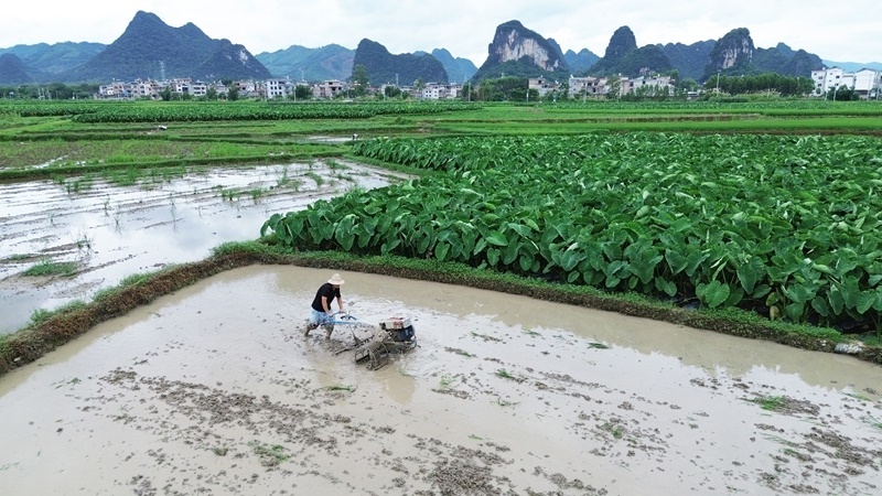 6月19日,廣西賀州市平桂區(qū)鵝塘鎮(zhèn)鵝塘村農(nóng)民操作農(nóng)機(jī)耕田(無(wú)人機(jī)照片)。
