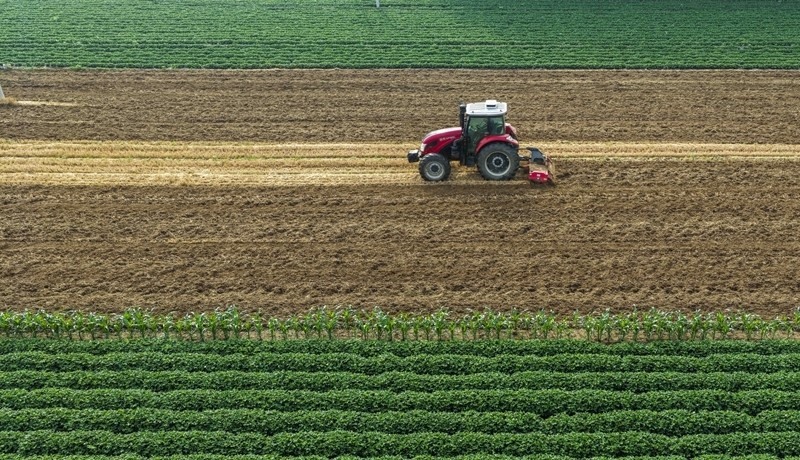 6月19日,河北省遵化市東新莊鎮(zhèn)農(nóng)民駕駛農(nóng)機(jī)旋耕土地(無(wú)人機(jī)照片)。