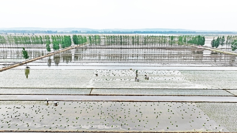 6月19日,山東省臨沂市郯城縣郯城街道農(nóng)民進(jìn)行水稻插秧(無(wú)人機(jī)照片)。
