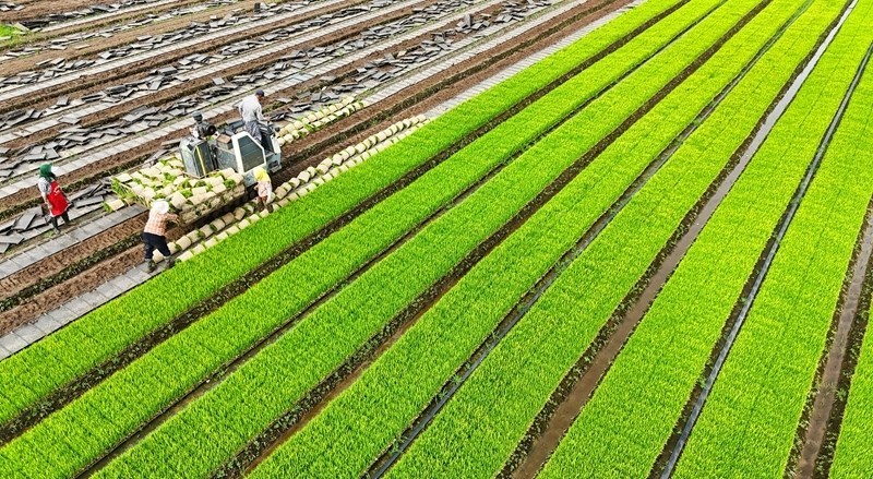 6月18日,在江蘇省海安市墩頭鎮(zhèn)千步村,農(nóng)民起水稻秧苗,準(zhǔn)備進(jìn)行水稻機(jī)插(無(wú)人機(jī)照片)。
