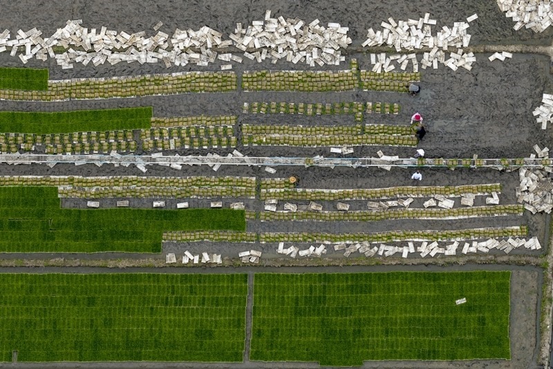 6月19日,在江蘇省連云港市東??h張灣鄉(xiāng)張灣村秧板田里,農(nóng)民起水稻秧苗準(zhǔn)備進(jìn)行機(jī)插作業(yè)(無(wú)人機(jī)照片)。