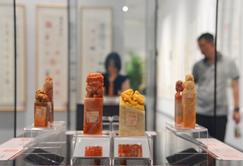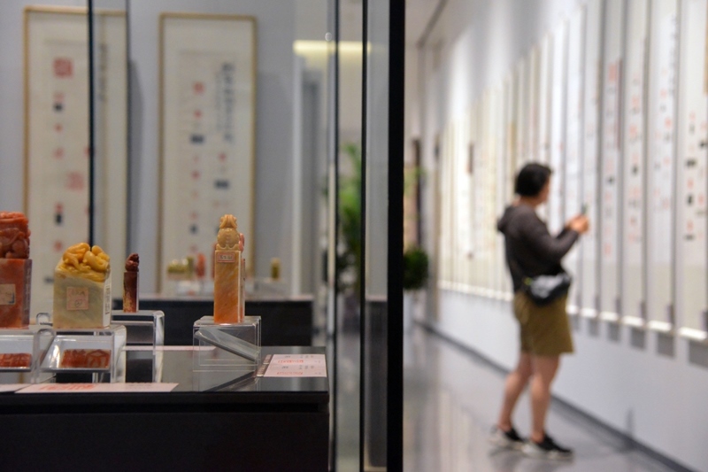 6月21日,觀(guān)眾在北京市海淀區(qū)三山五園文化藝術(shù)中心參觀(guān)薪傳國(guó)粹——“萬(wàn)印樓”新藏當(dāng)代國(guó)際篆刻精品展。