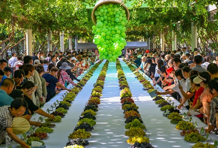 人們在新疆吐魯番特色葡萄集市上品嘗葡萄(2024年8月17日攝)。新華社記者 陳朔 攝