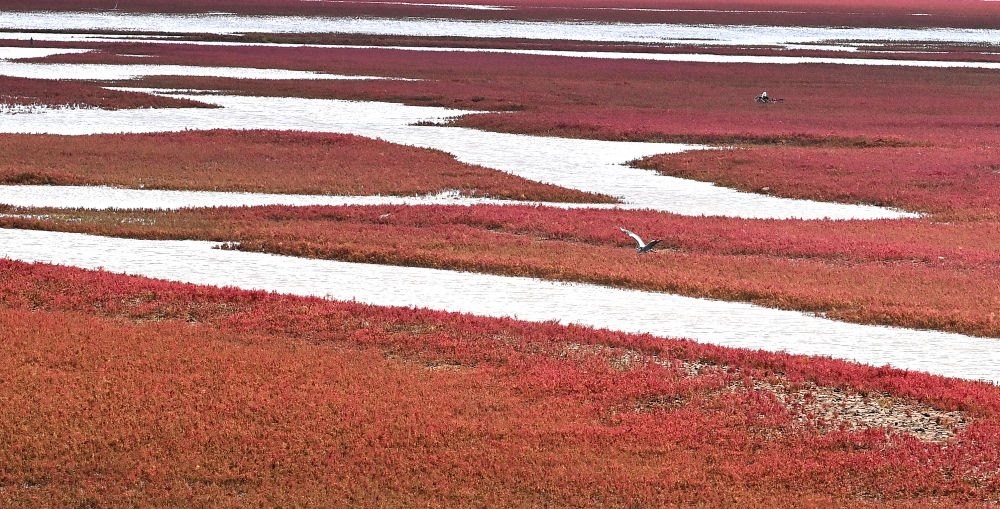盤錦遼河口潮間帶,堿蓬草向陽生長(zhǎng)。堿蓬草不僅能固碳,還能抵御海浪侵蝕。盤錦市自然資源局副局長(zhǎng)孫磊蹲在灘邊說:“堿蓬草對(duì)生態(tài)環(huán)境很敏感,以前自然岸線破壞、海水鹽度變化曾使堿蓬草大量減少,如今,大片堿蓬草到秋天就會(huì)變紅,這是生態(tài)向好的最佳信號(hào)?!?/p>