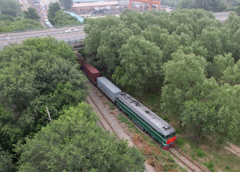 6月30日,首趟北京至阿塞拜疆巴庫(kù)的跨里海中歐班列發(fā)車(無(wú)人機(jī)照片)。