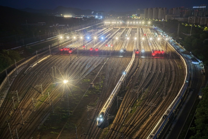 6月30日,動車組列車駛出南京動車段南京南動車運用所(無人機照片)。